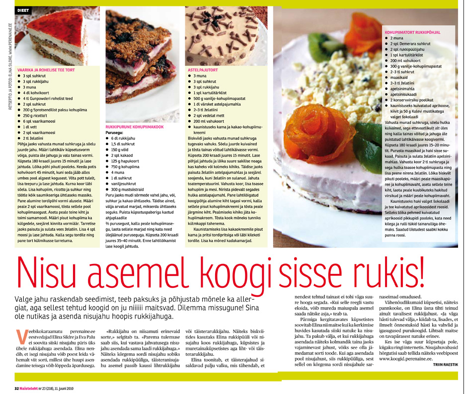 Eelmise nädala Naistelehes ilmus lugu rukkijahuga küpsetistest meie retseptide ja väikeste nõuannetega. Rukkijahusid on erinevaid sorte ja parima tulemuse saab siis kui vastava jahvatusega nisujahu asendada sama laadi rukkijahuga, jagab Elina oma kogemust. Näiteks kõrgema sordi nisujahu sobiks asendada rukkipüüliga, täisteranisujahu asemel passib kaussi lihtrukkijahu või täisterarukkijahu.