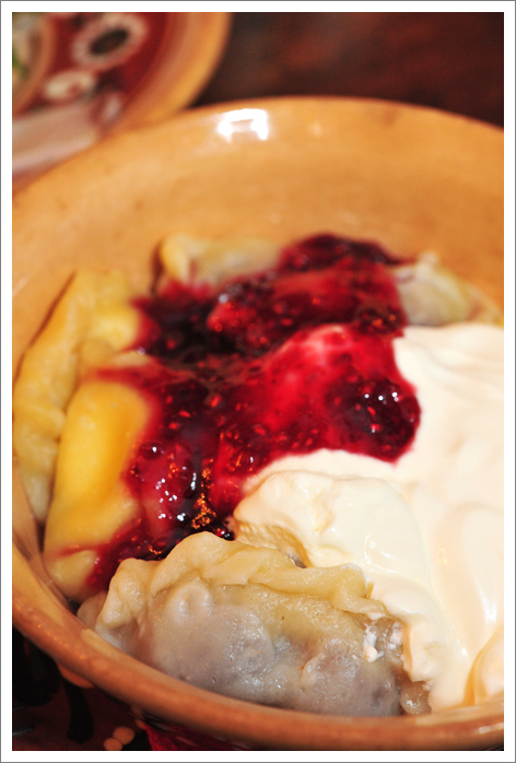 Vareenikud, täidiseks kirsid ja kohupiim, kastmeks kohupiim ja vaarikamoos.