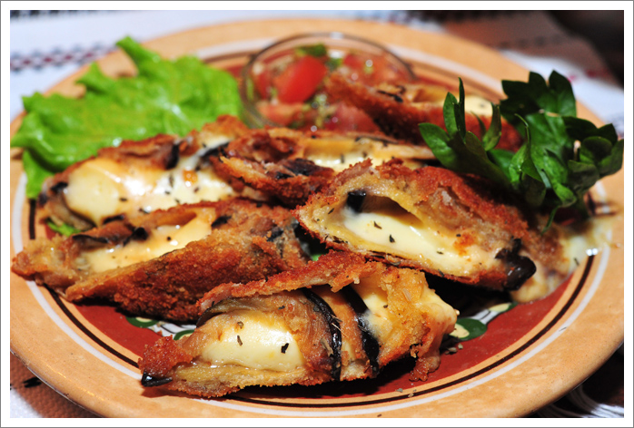 Maitsesin baklažaanirulle (seal pildi peal, kus soolapekk) – see oli eelroog, siis sulugani juustuga täidetud baklažaane (kah pildil), kartulipannkooke ja siis vareenikuid. Kõik olid maitsvad!