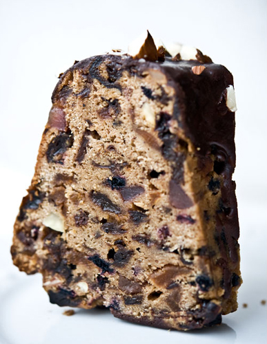 Järgmisel päeval kuumuta ahi 160 kraadini. Sõelu kaussi jahu, sool, vürtsid ja kakaopulber. Määri 20-cm läbimõõduga koogivorm (või ümmargune keeksivorm) võiga (ja vooderdada kahekordse küpsetuspaberiga). Vahusta munad suhkruga. Sega lõpuks sisse apelsini- või sidrunikoor, jahvatatud ning hakitud mandlid, kuivatatud puuviljad ja jahusegu.