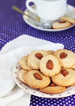 Vahusta toasoe või suhkru ja siirupiga. Lisa edasi vahustades muna. Sega omavahel kuivained ja sega või-munasegu juurde. Vormi tainast väikesed pallid, aseta küpsetuspaberiga kaetud ahjuplaadile ja vajuta laiaks, aseta keskele poolik mandel. Küpseta küpsiseid 175-kraadises ahjus u. 15 minutit või kuni küpsised on kuldpruunid. Retsept: Pereköök, foto: Marit Soobik (Perenaine.ee)