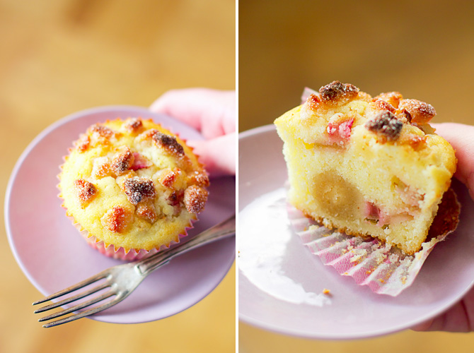 Lisa vedelad koostisained kuivadele. Sega pisut. Lisa rabarber ja sega läbi. Ära liialt klopi, las jääda pisut klimbine. Kukuta igasse muffiniauku kaks supilusikatäit tainast, siis libista keskele martsipanipallid ja kata ülejäänud tainaga.