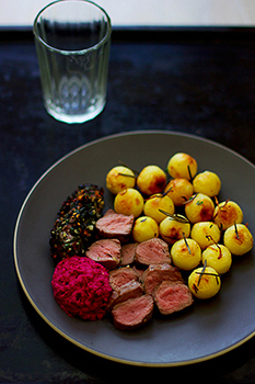 Pane ahi 230 kraadini eelkuumenema. Haki petersell, tüümian, rosmariin ja küüslauk hästi peeneks. Lihtsam on selleks kasutada köögikombaini. Puista ürdisegu lõikelauale, lisa soola ja pipart. Võib juhtuda, et pead filee keskelt pooleks lõikama, kui see tervenisti pannile ei mahu. Rulli fileed ürdisegus nii, et see oleks ümberringi ühtlaselt kaetud. Tõsta...