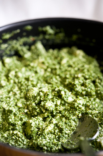 Tükelda paneer. Sulata spinat, nõruta (pigista vesi välja). Pane ootele. Haki sibul. Kuumuta panni peal õlis riivitud ingver, et õli omastaks vürtsi maitse (u. 15 sekundit). Lisa tšilli ja kurkum. Sega ühtlaseks. Lisa sibul, prae see kiirelt klaasjaks. Lisa spinat, sool, koor ja piim, keeda madalal tulel 2 minutit. Eemalda pannilt...