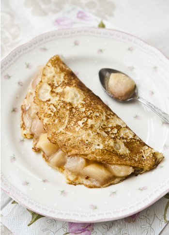 Lõika virsikute põhjale väike ristike. Aseta virsikud 10 sekundiks äsja keema läinud vette. Tõsta välja ja eemalda koor. Eemalda ka kivid. Tükelda virsikud. Pane pannile vesi, suhkrud ja või. Kuumuta kuniks suhkur on sulanud. Tõsta pannile virsikutükid ja kuumuta neid paar minutit, kuniks need kergelt pehmenevad. Küpseta pannkoogid. Aseta täidis pannkoogi...
