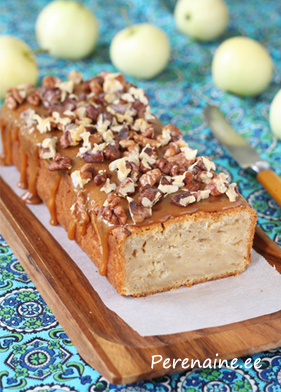 Vahusta või suhkruga, lisa edasi vahustades ükshaaval munad. Sega juurde hapukoor ja omavahel segatud kuivained. Pigista riivitud õuntelt liigne vedelik ja lisa tainale. Sega ühtlaseks massiks ja vala küpsetuspaberiga kaetud keeksivormi. Küpseta 170-kraadises ahjus u. 1 tund ja 10 minutit. Kontrolli küpsust puutikuga.Eemalda vormist ja lase täielikult maha jahtuda. Katteks sulata potis...