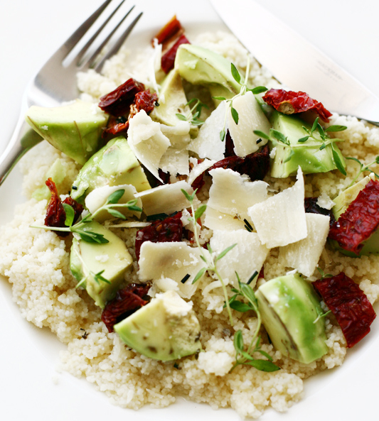 Sega kausis kuskuss ja puljongimaitseaine ning vala peale 3 dl keevat vett. Kata kauss kaanega ja lase 5 minutit haududa. Sega kastmekomponendid ja maitsesta. Lisa kaste kuskussile ja sega kahvliga ilusti läbi. Haki tomatid, avokaado ja viiluta juust ning tõsta kõik kuskussi hulka. Enne serveerimist lisa maitseroheline. Retsept ja foto: Eva Pärtel (Perenaine.ee)