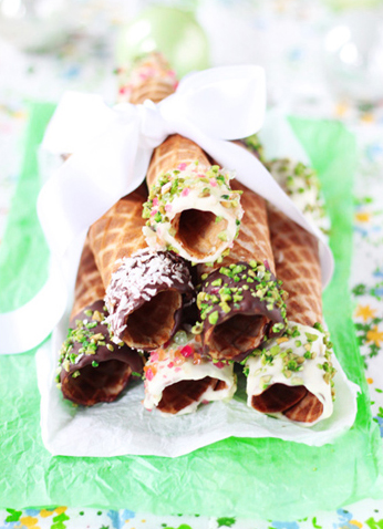 Vahusta munad suhkruga kohevaks, lisa sulatatud või. Sega juurde vaheldumisi jahu-tärklise-piparkoogimaitseaine segu ja piim. Lase tainal tund aega seista. Vajadusel lisa piima või jahu – tainas peab olema üsna vedel (sarnane ülepannkoogi-tainale). Küpseta vahvlimasinas vahvlid. Kasta vahvlid sulatatud šokolaadi, kaunista näiteks kookoshelveste, hakitud pähklite või nonparellidega. Lase šokolaadil taheneda ja...