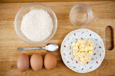 Mõõda valmis jahu kogus. Tükelda külm või. Pane vesi, või ja sool potti ja kuumuta keskmisel kuumusel kuniks või on sulanud ja segu on just keema minemas. Sega nii harva kui vajalik, sest segamisega aurustub liigselt vedelikku. Eemalda ruttu pliidilt ja lisa jahu. Hakka saadud massi intensiivselt lusikaga kloppima. Segu näeb välja alguses üsna ebamäärane…