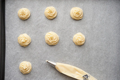 Pane valmis tainamass kondiitrikotti (või kasuta kilekotti), lisa eelnevalt ka sakiline kondiitriotsik. Kata ahjuplaat küpsetuspaberiga ja lase kondiitrikotist ahjuplaadile tainapallid, jättes nende vahele piisava vahemaa kerkmiseks. Pallikeste kõrgus võiks olla 3 cm ja läbimõõt samuti 3 cm. Tee üks sõrm märjaks ja vajuta alla tekkinud kõrged tipud (need võivad küpsetamise käigus liigselt pruunistuda).