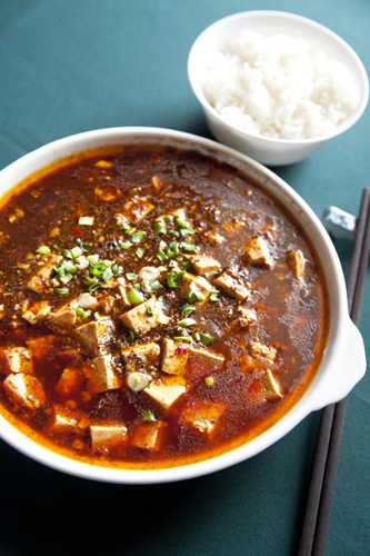 Lõika tofu 2 cm suurusteks kandilisteks tükkideks. Haki küüslauk ja ingver hästi peeneks, lõika ka roheline sibul peeneks. Kuumuta pannil õli. Lisa sealiha tükid (2 cm suurused) ja kui need on juba värvi muutnud, lisa ingver, küüslauk ja tšillipasta liha juurde. Prae mõned minutid. Lisa vesi, sojakaste ja tofu. Keeda...