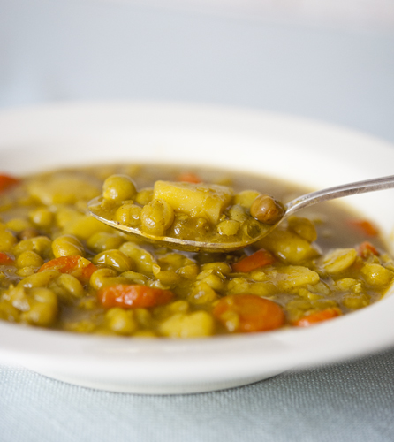 Pane herned üleööks külma vette likku. Tükelda kartulid ja porgandid. Kuumuta pannil õli. Lisa kurkum ja Cayanne’i pipar, lase õlil mõned sekundid maitsestuda. Lisa kartulid ja porgandid ning prae kergelt läbi. Pane herned koos leotusvee ning praetud kartulite ja porganditega keema (lisa vajadusel vett). Lisa puljongikuubik ning keeda ca 1 tund madalal...