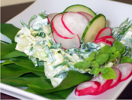 Lisa hakitud karulaugu ja rebitud jääsalati hulka kurk ja redis ning sega kastmega. Serveeri. Retsept ja foto: Maris Schryer (Perenaine.ee)