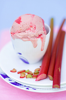 Hauta rabarberit suhkru ja maasikamahlaga madalal tulel kuni rabarber on pehme, seejärel püreesta blenderis. Kuumuta potis piim, vahukoor ja vanill keemistemperatuurini, tõsta tulelt. Vahusta munakollased suhkruga. Kalla kuum piima-kooresegu vähehaaval munakollastele, hoolega segades. Kuumuta saadud segu vesivannil kuni see pakseneb ja sarnaneb vanillikastmega, nii 10-15 minutit. Jahuta jäävannis. Eemalda vanillikaun....