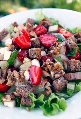 Lõika maasikad pooleks või neljaks, tükelda vajadusel ananass. Lõika suitsujuust kuubikuteks, viiluta kurk. Tükelda leivaviilud ja rösti kuumal, kuival pannil krõbedaks. Kastmeained sega omavahel. Rebi salat väiksemateks tükkideks ja lao taldrikule. Tõsta peale ülejäänud koostisosad ja nirista üle kastmega, serveeri kohe. Sellest kogusest saab 2 portsu. Retsept ja foto: Elina Sildre (Perenaine.ee)
