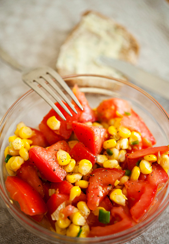 Keeda maisitõlvik pehmeks (u. 10-15 minutit) ja eemalda (noa abiga) maisiterad. Sega marinaadiks kokku oliivõli, äädikas, 3/4 tl soola ja 1/4 tl pipart. Lõigu tomat ja kalla peale valminud marinaad, sega ja jäta ootele. Tükelda noaga roheline sibul. Eralda valged osad ja prae need võis, kuniks need on omandanud kuldse värvuse....