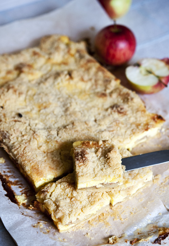 Näpi jahu ja suhkur võiga ühtlaseks puruks. Laota kolmveerand taignast suurele, kõrgete äärtega ahjuplaadile. Koori, puhasta ja viiluta õunad ning jaota ühtlaselt purukattega. Raputa üle suhkru ja kaneeliga. Vahusta munad suhkruga, sega hulka hapukoor, kohupiim ja manna. Vala ettevaatlikult õunte peale ja pudista peale ülejäänud purutaigen. Küpseta 200-kraadises ahjus 30-40 minutit kuniks...