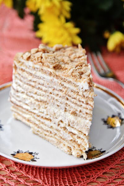 Vahusta munad ja suhkur kohevaks vahuks. Sulata potis või ja lisa mesi. Tõsta hulka munavaht. Kuumuta segu pidevalt segades keemiseni ning tõsta tulelt. Lisa jahu-küpsetuspulbrisegu ja sega ühtlaseks. Jaga tainas 10 palliks ning rulli kergelt jahusel laual ümmargused, hästi õhukesed tükid, mis on 20 cm läbimõõduga. Seda on kõige mugavam teha...