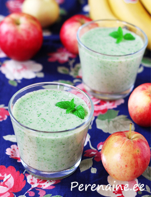 Koori ja viiluta õunad, pane koos banaani ja spinatiga blenderisse. Lisa ka veidi õunamahla. Blenderda ühtlaseks. Viimasena lisa jogurt ja niipalju mahla, et saavutad paraja konsistensi. Serveeri kohe. Sellest kogusest tuleb u. kaks väikest klaasi smuutit. Retsept ja foto: Marit Soobik (Perenaine.ee)