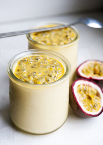 Pane koor ja suhkur potti ja kuumuta keemiseni. Keeda madalal tulel pidevalt segades 2-3 minutit. Eemalda tulelt ja lase ca 5 minutit jahtuda. Sega sisse passionipüree ja kalla segu magustoidu vormidesse. Segu on veel vedel, kuid taheneb jahtudes. Selleks jahuta kreem esmalt toatemperatuurini ning seejärel ca 3 tundi külmikus. Soovi...