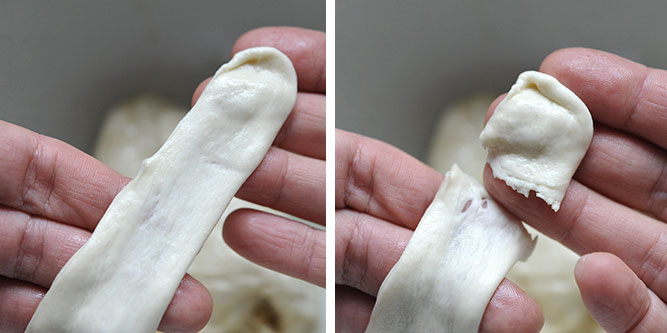 Selleks tee tainapall kaheks ja tee need üleni oliiviõliga kokku (seda on kõige mugavam käte vahel teha). Venita taigent nii, et see on õhuke ja lapik ning “rebi” sellise tainariba küljest paraja suurusega nuudel, viska see potti.
