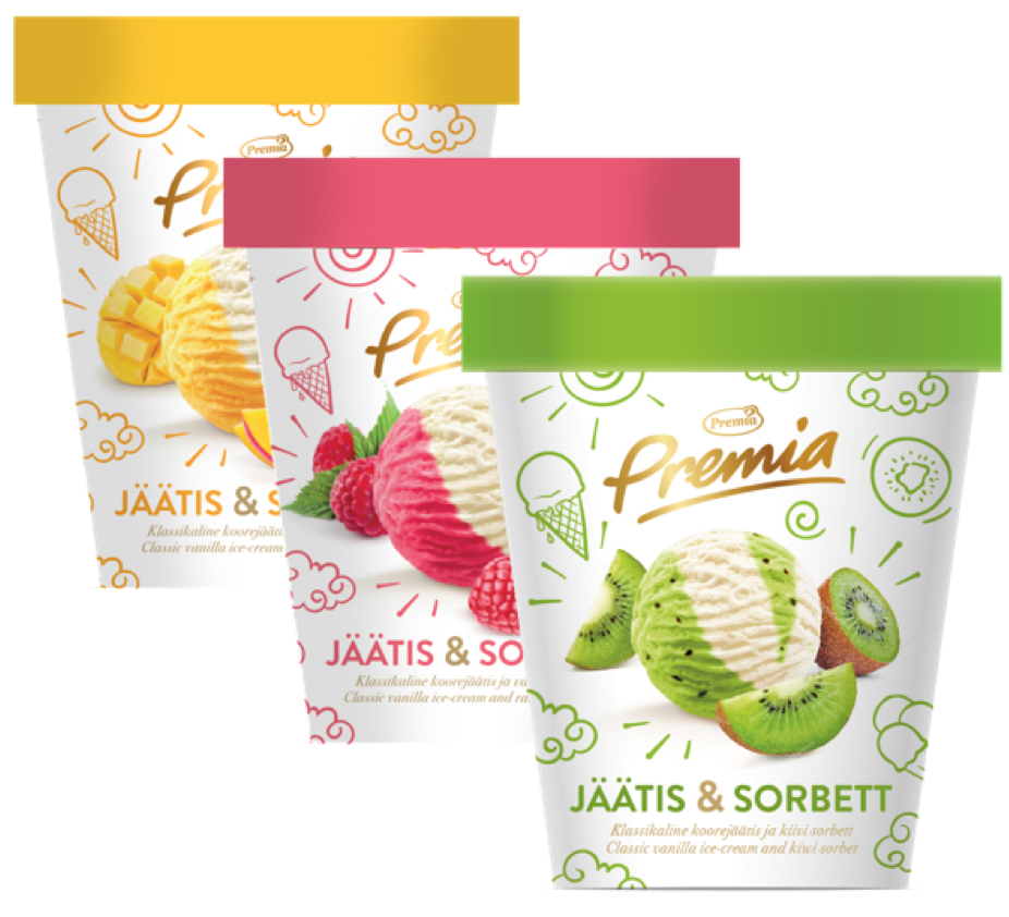 Premia Jäätis & sorbett. Topsis on kõrvuti vaniljejäätis ja sorbett (50-50) ning Premia juhatuse esimehe Aivar Ausi sõnul on see maitse poolest eriti hästi sobiv kooslus – hapukas sorbett kõrvuti magusa-kreemise vaniljejäätisega. Toode on nii uus, et jõuab müügile alles mai lõpus.