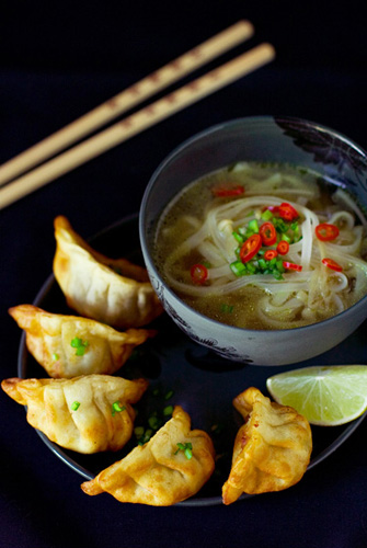 Pane koos puljongiga potti küüslauk, tükkideks rebitud kaffirlaimi lehed, sidrunhein (värske sidrunhein tuleb lõigata 2 cm tükkideks ja kergelt puruks muljuda), riivitud ingver, poole laimi mahl ning riivitud koor ja kalakaste. Keeda umbes 7 minutit, kuni kõik aroomid on vallandunud. Nüüd võid puljongi läbi sõela kurnata, et oleks hiljem hõlpsam...