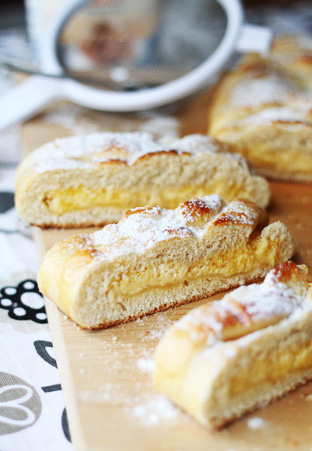Lahusta pärm käesoojas piimas. Löö muna klaasi, sega õrnalt läbi ja vala pool piima-pärmisegusse. Lisa suhkur ja sool. Sõtku vähehaaval juurde jahu. Viimasena lisa sulatatud jahutatud rasv. Sõtku. Lase rätiku all umbes pool tundi kerkida. Täidise jaoks sulata või, lisa sellele kohupiim, suhkur, vaniljesuhkur ja kastmepulber. Jaga kerkinud tainas kaheks...