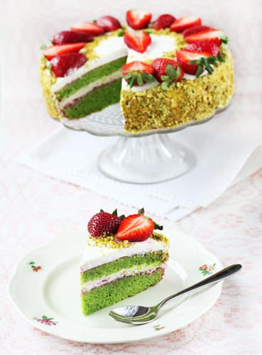 Pese spinat, lisa õli ja püreesta saumiksriga ühtlaseks tükivabaks massiks. Vahusta toasoojad munad suhkruga kohevaks vahuks. Lisa ettevaatlikult segades sidrunimahla ja spinati-õlipüree. Viimasena lisa kuivainesegu. Vala tainas u. 22-24 cm lahtikäivasse koogivormi ja küpseta 180-kraadises ahjus u. 25 minutit. Kreemiks vahusta vahukoor suhkruga ja lisa juurde Kreeka jogurt ja vanilliekstrakt. Jahuta kook ja lõika...
