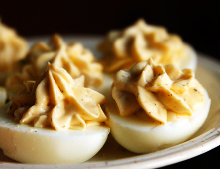 Koori munad ja lõika pooleks. Uurista välja munakollased ja tee kahvliga peeneks. Lisa munakollastele sulatatud juust ning hapukoor ja sega ühtlaseks. Täida tordipritsiga munavalge-poolikud. Retsept ja foto: Elina Sildre (Perenaine.ee)
