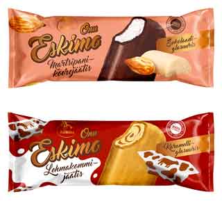 Onu Eskimo martsipani-koorejäätis. Šokolaadikatte all kreemine koorejäätis, millel tuntav martsipani maitse. Naturaalse puhta maitsega pulgajäätis.