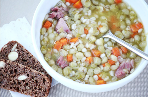 Pane herned kaussi, vala peale 1 liiter külma vett ning jäta herned 8-12 tunniks likku. Pane herned koos leotusvee, kuubikuteks lõigatud porgandite, odrakruupide ja suitsukoodiga keema. Lisa loorberilehed ja ülejäänud vesi. Keeda tasasel tulel, kuni herned on pehmed. Sõltuvalt hernestest võib see võtta aega umbes 40 minutit kuni 1,5...