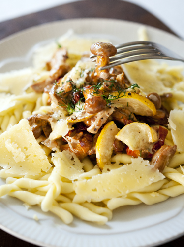 Puhasta seened. Pane pannile ja kuumuta, kuniks vedelik on seentest välja aurustunud. Prae seened võiga pruunikaks, maitsesta soolaga. Tõsta ootele. Tükelda suvikõrvits ja prae pannil pehmeks. Tõsta pannile kukeseened ja tükeldatud päikesekuivatatud tomatid. Kalla peale koor ja keeda mõned minutid. Maitsesta soola-pipraga. Keeda pasta, kurna, nirista peale pisut oliiviõli. Tõsta pasta taldrikutele ja aseta...