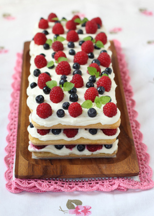 Vahusta kreemiks vahukoor suhkruga, lisa ka toorjuust, sega ühtlaseks kreemiks. Võta piklik koogialus, immuta küpsiseid apelsinimahlas, aseta küpsised teineteise kõrvale alusele. Laota peale toorjuustukreem, kata marjadega. Tee nii veel kaks kihti. Pealmiseks kihiks jäta ainult toorjuustukreem. Aseta kook vähemalt neljaks tunniks külmikusse (veel parem terveks ööks). Vahetult enne serveerimist kaunista kook...