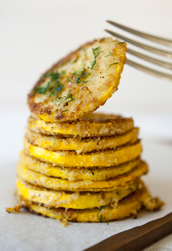 Klopi muna kausis lahti. Puista laiemale taldrikule riivsaia. Kasta suvikõrvitsaviil muna sisse ja tõsta see siis riivsaia sisse, tehes selle mõlemalt poolt riivsaiaseks. Prae pannil mõlemalt poolt pruuniks. Võta tulelt ning raputa peale soola ja tilli. Retsept ja foto: Eva Pärtel (Perenaine.ee)