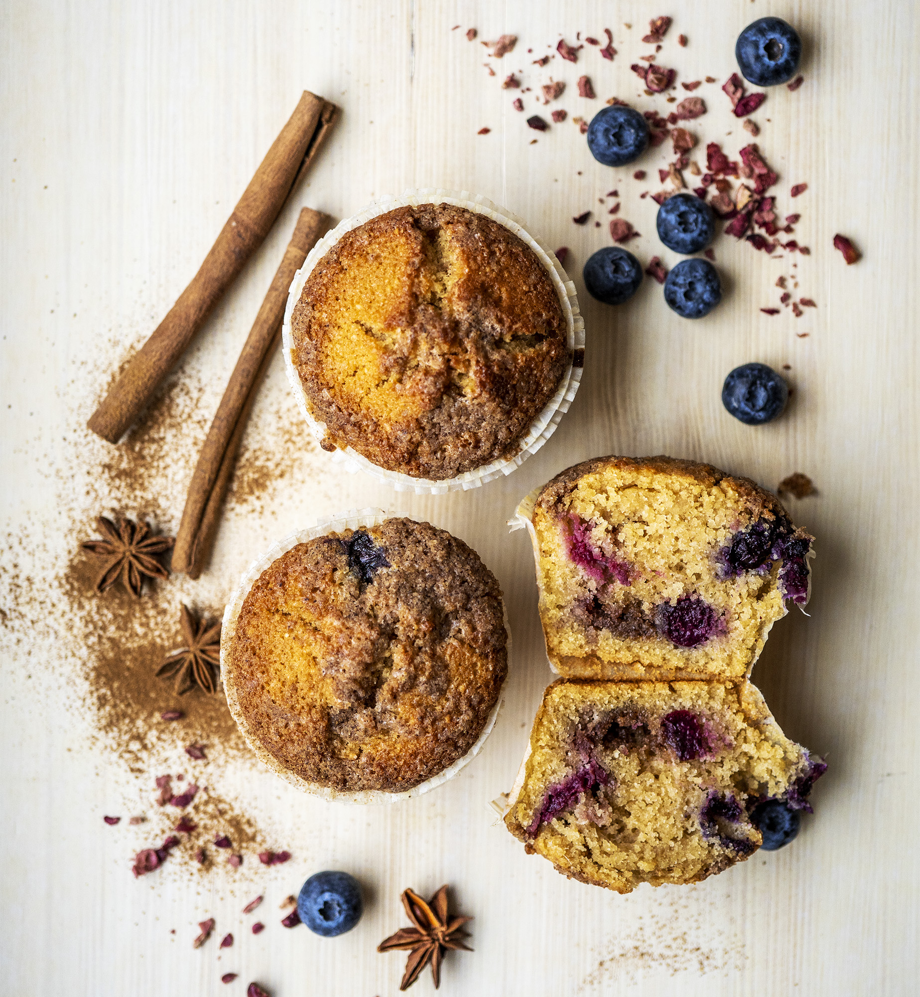 Vispelda munad ja suhkur, lisa õli ja piim. Sega kuivained ja lisa muffinitainale, võimalikult vähe segades. Lisa mustikad ja kirsid – kui külmutatud, ära neid üles sulata. Tõsta muffinipesadesse (8 tk). Katteks näpi ained purutainaks ja pudista muffinitele.