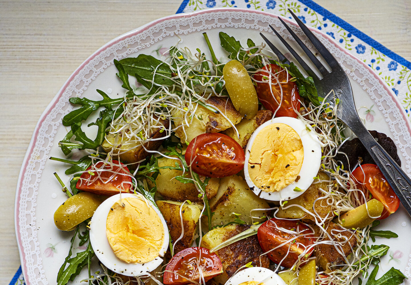 Sega kokku salatikaste ning sega pestud ja nõrutatud rukolaga. Jaga salat kahe taldriku peale. Tõsta peale parmesani juust. Lõika kirsstomatid ja munad sektoriteks ning tõsta salatile. Prae kartulid krõbedaks ja pruuniks. Tõsta salati keskele ja aseta kõige peale idandid. Raputa üle musta pipra ja piinipähklitega ning serveeri kohe. Nippe ja nõuandeid:  Lisa salatisse ka praetud suvikõrvitsaviile...