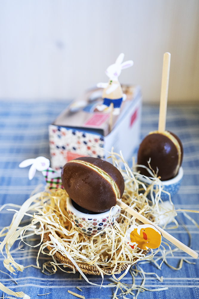 Poolita üllatusmunad ja eemalda mänguasjad. Täida munapoolikud tihedalt jäätisega, tõsta ühe pooliku peale jäätisepulk ja ühenda teise poolikuga. Aseta vähemalt 5 tunniks sügavkülmikusse. Retsept ja foto: Eva Pärtel (Perenaine.ee), idee: Kinuskikissa