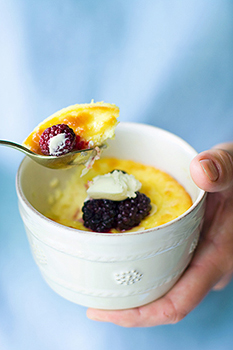 Eelsoenda ahi 170 kraadini. Sega mascarpone ja kohupiim ühtlaseks kergeks massiks. Teises kausis löö kokku munakollased, suhkur, jahvatatud mandlid, vanill ja apelsini koor. Lisa munasegu kohupiimasegule, sega läbi ja jaota nelja ramekin-vormi. Küpseta ahjus 20-25 minutit. Serveeri marjade või toormoosi ja vahukoorega. Retsept ja foto: Elisa Koor (Perenaine.ee)
