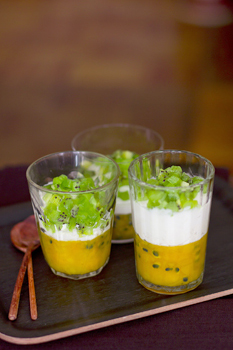 Ava mangokonserv. Kurna siirup kruusi, tükelda mango kuubikuteks. Paisuta želatiinilehti 5 minutit külmas vees. Soojenda granadilli viljaliha 45 kraadini ja sulata želatiinilehed seal sees. Sega kokku 100 g mangokuubikuid, mandariinimahl, želatiini-granadilli segu ja umbes 100ml mangokonservist nõrutatud siirupit. Kalla saadud segu nelja 200 ml klaasi, kata toidukilega ja pane mitmeks tunniks...