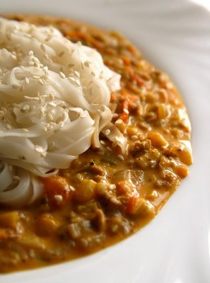 Kuumuta potipõhjas õli, lisa hakkliha ja pruunista. Lisa hakitud sibul, küüslauk ja riivitud porgand. Prae keskmisel kuumusel umbes 10 minutit. Lisa kuubikuteks lõigatud tomat, viilutatud porru, konservmais, karripasta ja kookospiim. Keeda vaiksel tulel umbes 10 minutit. Maitsesta soolaga. Lõpus lisa veel seesamiseemneid. Neid võid ka serveerimisel lisada. Retsept ja foto: Elina...
