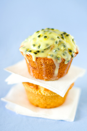 Pane ahi 200 kraadile sooja. Valmista ette muffinivormid. Sõelu jahu ja küpsetuspulber kaussi, sega juurde suhkur ja šokolaaditükid. Tee keskele süvend. Klopi muna hulka või, piim, granadillipüree ja vanilliekstrakt. Kalla jahukausis olevasse süvendisse. Sega just nii palju, et kõik oleks segunenud, aga mitte rohkem. Tõsta tainas valmis pandud muffinivormidesse. Küpseta...
