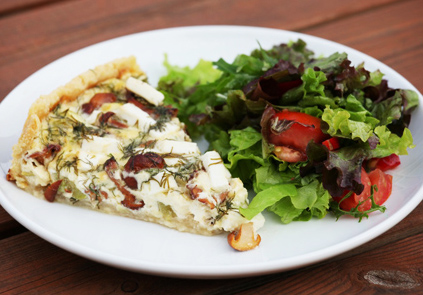 Tainaks näpi külmad võitükid jahu ja riivjuustu segusse, lisa paar supilusikatäit külma vett. Sega käte vahel ühtlaseks tainaks. Suru tainas lahtise pirukavormi põhjale ja servadesse ning aseta vähemalt pooleks tunniks külmkappi. Eelküpseta põhja 200-kraadises ahjus 8-10 minutit, kuniks see hakkab pruunistuma. Prae kukeseened pannil võiga. Samuti prae suvikõrvitsakuubikud õlis. Aseta kukeseened...