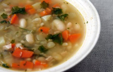 Kalla pestud kruubid puljongisse ja keeda poolpehmeks. Lisa tükeldatud porgand. Kuumuta õli pannil ja lisa hakitud sibulad. Prae paar minutit, lisa hakitud küüslauk ja prae veel pisut, kalla hulka valge vein ja kuumuta kuni vedelik on aurustunud. Kui porgand on poolpehme, lisa kartulikuubikud, tükeldatud sink ja praetud sibul. Keeda kuni...