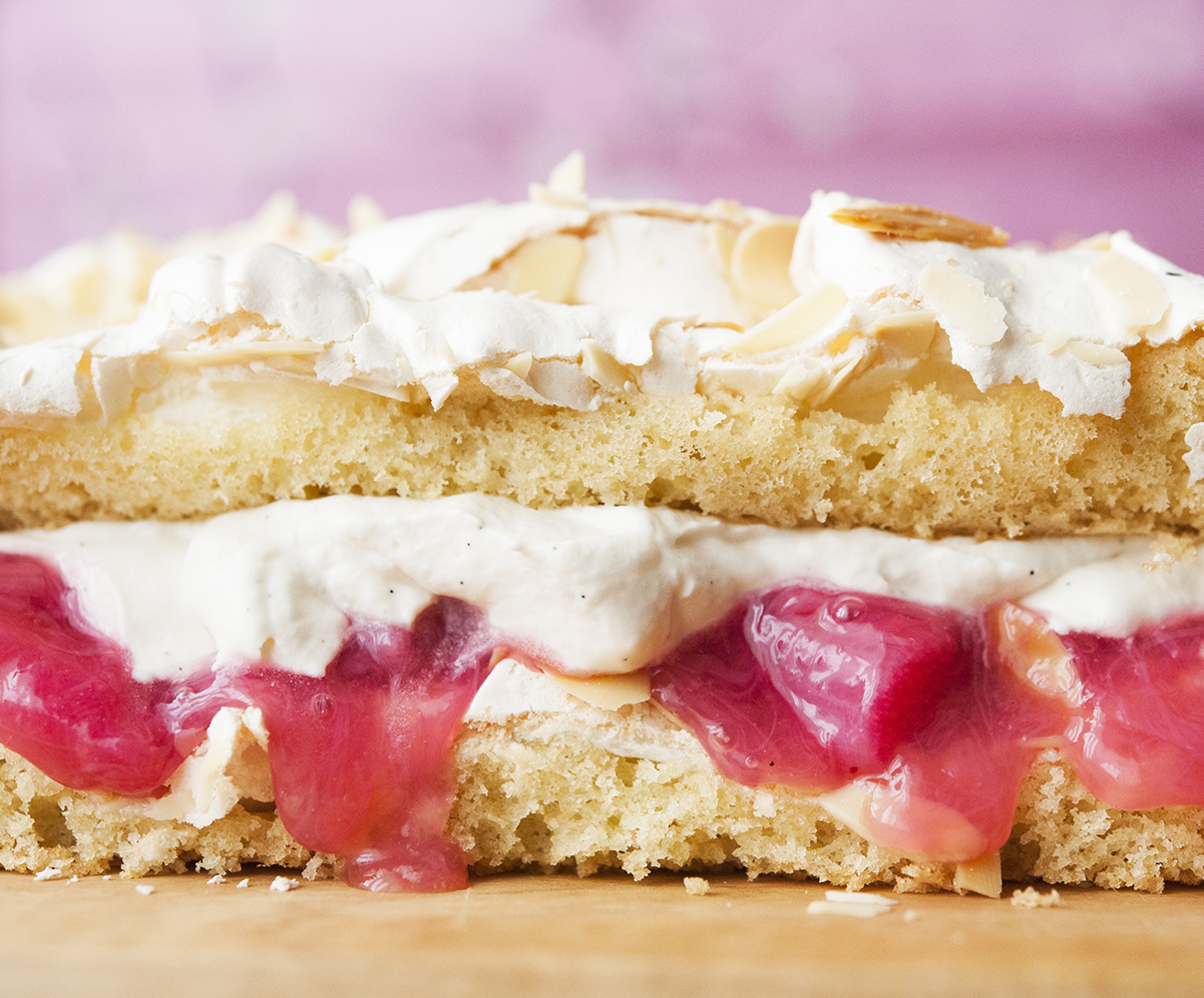 Beseerulliks vahusta munavalged pehme vahuni. Nirista sisse suhkur ja jätka mikserdamist kuniks vaht on tugev. Sõelu sisse maisitärklis ja klopi ühtlaseks. Tõsta mass küpsetuspaberiga kaetud ahjuplaadile (35×40 cm) ja määri ühtlaselt laiali. Raputa ühtlaselt peale mandlilaastud. Küpseta 170-kraadises ahjus 20 minutit. Võta ahjust ja kummuta puhtale küpsetuspaberile. Jahuta täielikult. Rabarberitäidiseks...