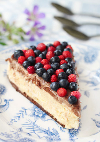Purusta küpsised, sega sulatatud võiga. Suru segu 26 cm-se läbimõõduga koogivormi põhja. Kata põhi ühtlase kihina marjadega. Kreemiks sulata hakitud valge šokolaad kuumaveevanni kohal. Sega vedel jahutatud šokolaad toasooja kohupiima hulka. Sega ühtlaseks ja lisa ettevaatlikult vahustatud vahukoor. Laota segu koogivormi ja lase tahkuda 6 tundi kuni üleöö. Retsept: Pereköök, foto: Marit Soobik (Perenaine.ee)
