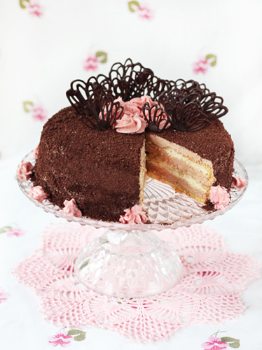 Vahusta munavalged tugevaks vahuks. Lisa osade kaupa suhkur. Seejärel lisa ükshaaval munakollased, samal ajal edasi vahustades. Sõelu ettevaatlikult juurde eelnevalt omavahel segatud kuivained. Vala tainas 20 cm läbimõõduga lahtikäivasse koogivormi. Küpseta biskviit 200-kraadises ahjus u. 15 minutit. Vahusta toasoe või kohevaks kreemiks, lisa kondenspiim ja kakao. Sega ühtlaseks. Lõika jahtunud biskviit kolmeks kihiks. Aseta üks koogipõhi...