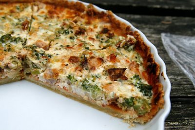 Tainaks näpi või, kodujuust ja jahu ühtlaseks. Lisa vajadusel nii palju vett, et tainas kokku hakkaks. Sõtku ühtlaseks, keera tainas kilesse ja pane 30 minutiks külmkappi. Kuumuta ahi 200 kraadini. Rulli tainas õhukeseks ja vooderda sellega pirukavorm, vajuta kahvliga põhja sisse väiksed augud ja küpseta umbes 8-10 minutit. Lõika brokoli...