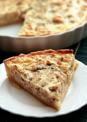 Haki külm või ja jahu ühtlaseks, lisa sool ja külm vesi, sega ühtlaseks. Vooderda 20 cm-se läbimõõduga lahtikäiv vorm küpsetuspaberiga või määri võiga. Suru tainas vormi põhja ja külgedele ja pane 15 minutiks külma. Haki sibulad ja prae õlis klaasaks, lisa äädikas ja suhkur, sega ning võta tulelt. Lisa kuubikuteks...