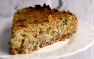 Sega koogipõhjaks helbed ja jahu soola ja küpsetuspulbriga. Lisa muna, õli ja kohupiim ja mätsi kokku tainas. Määri 24 cm-se läbimõõduga pirukavorm võiga ja suru tainas vormi põhja ja külgedele, eelküpseta 200-kraadises ahjus 10 minutit. Kuumuta pannil õli ja lisa hakitud sibulad. Prae kuni sibulad hakkavad kergelt värvi muutma, lisa...